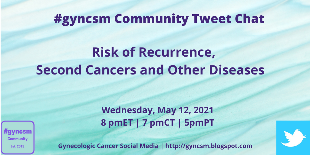 The #gyncsm community discussed Risk of Recurrence, Second Cancers, and Other Diseases for those diagnosed with a gynecologic cancer on May 12, 2021. We had twenty-six participants and 1.330 Million impressions - see more analytics here and you may read the transcript here.